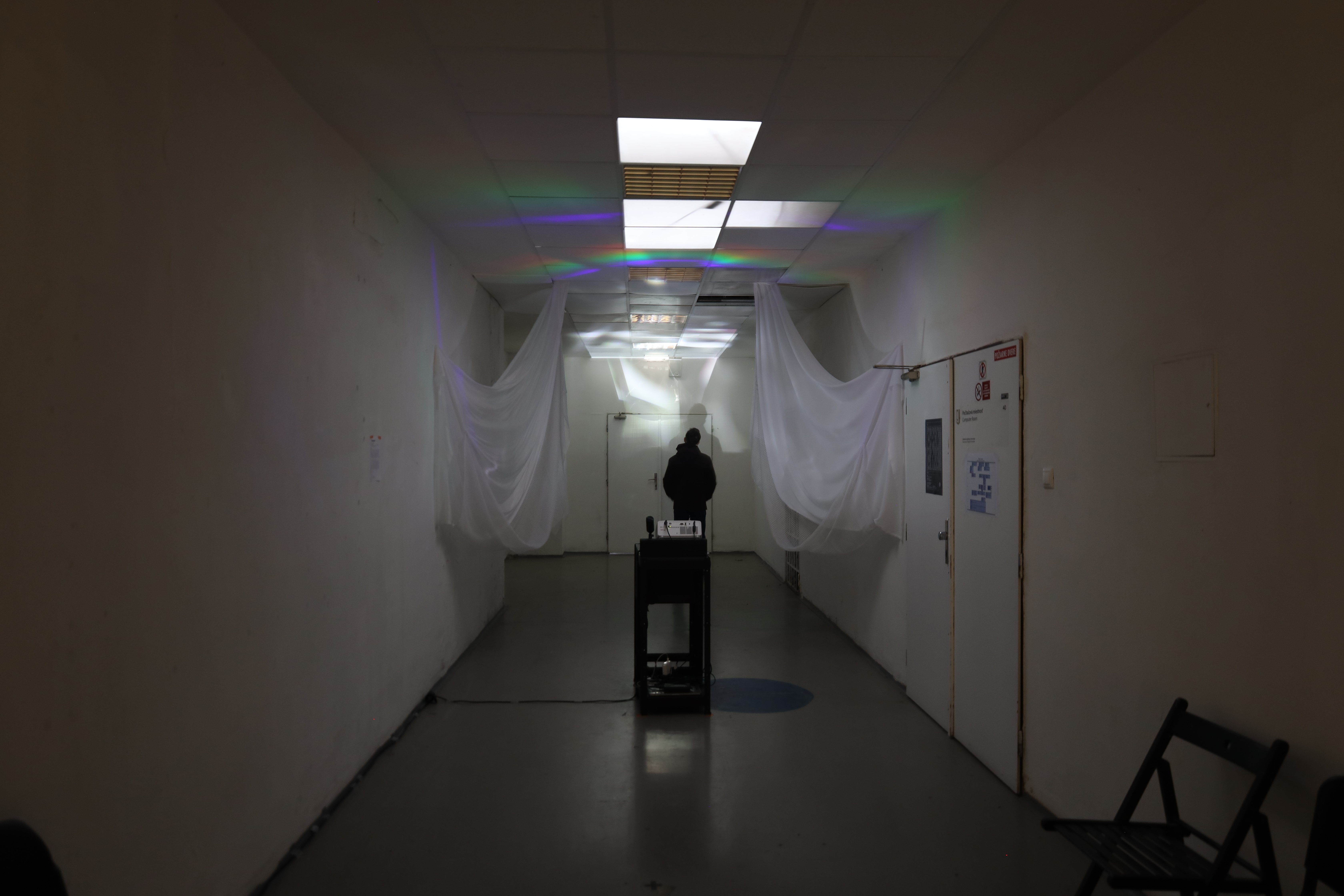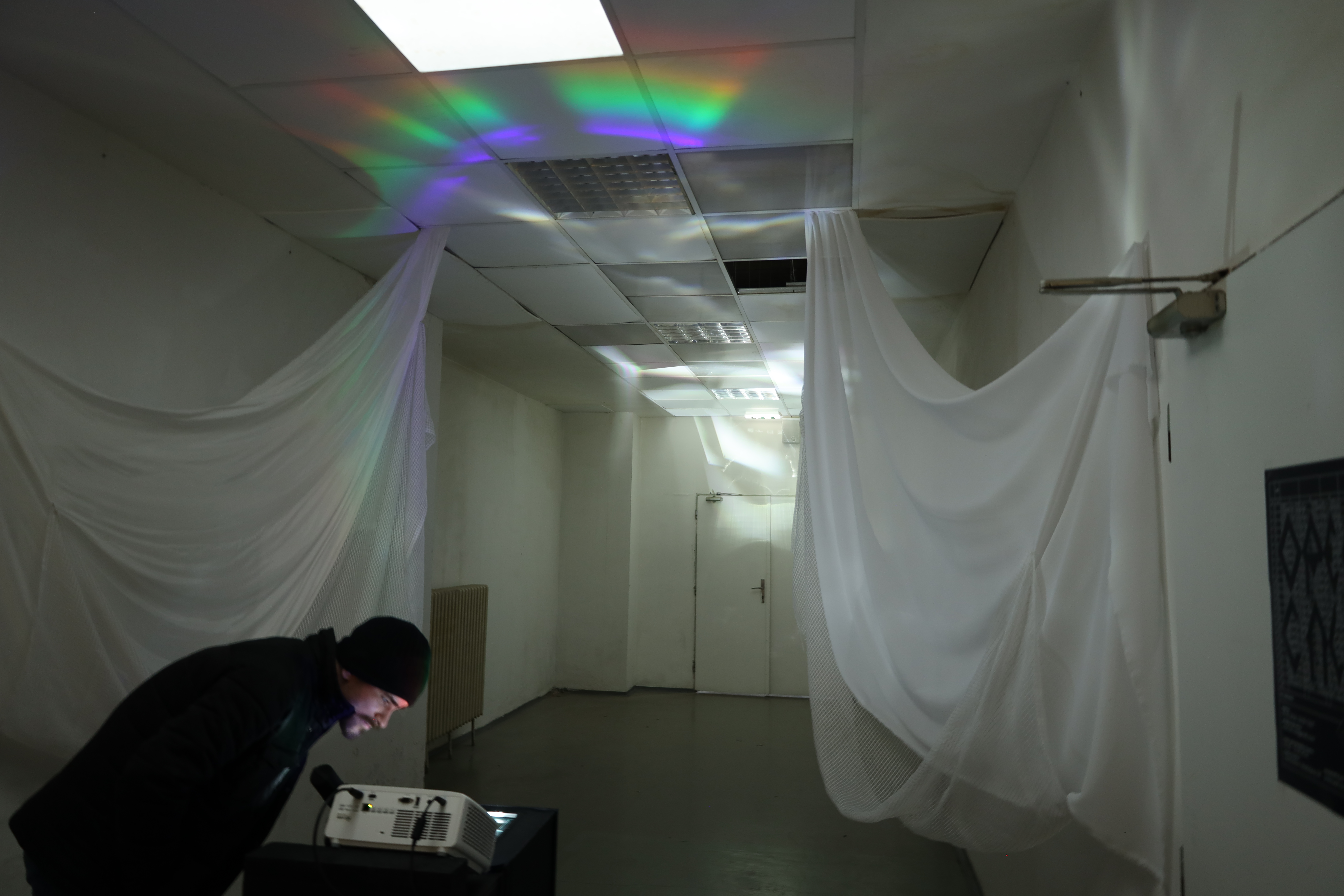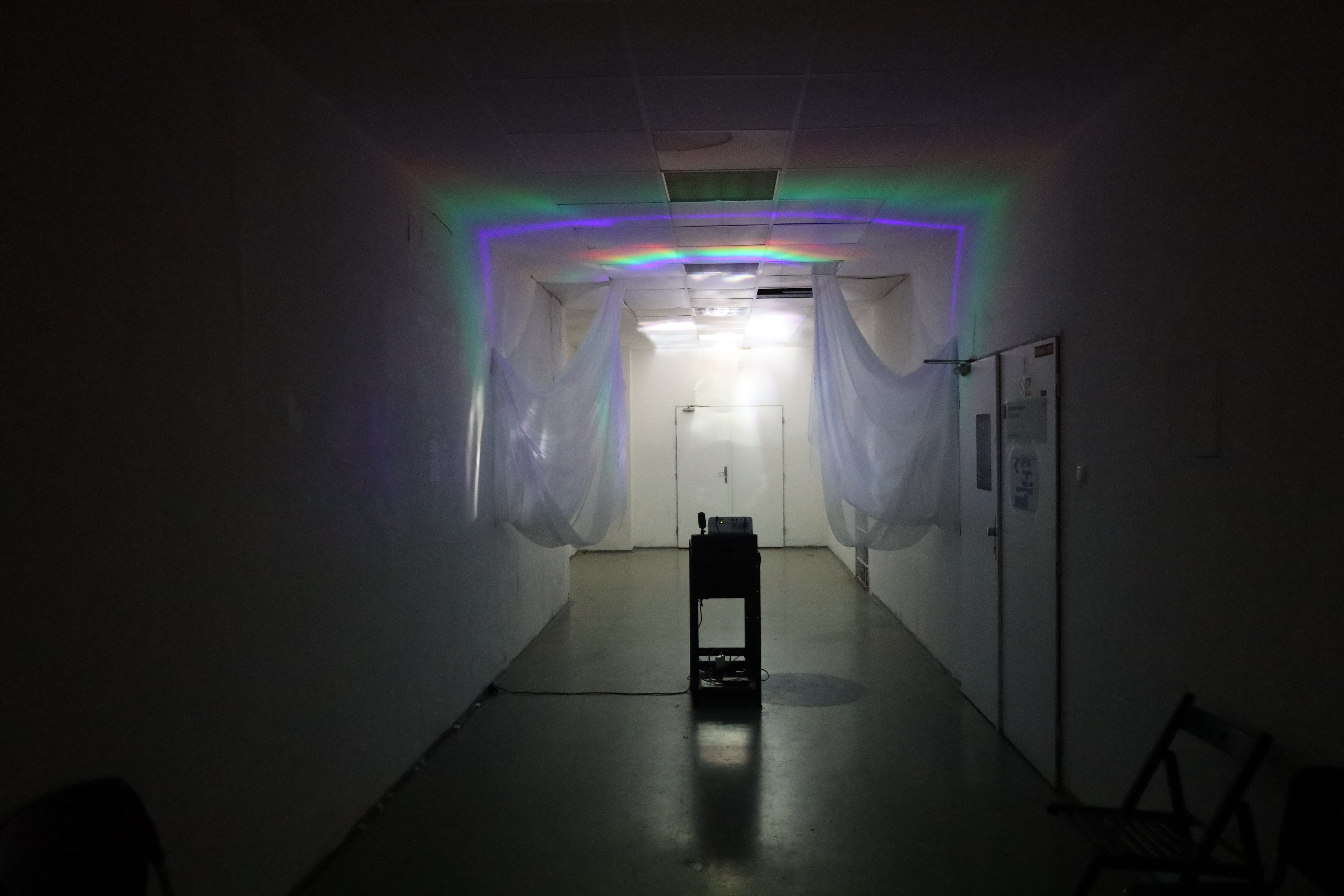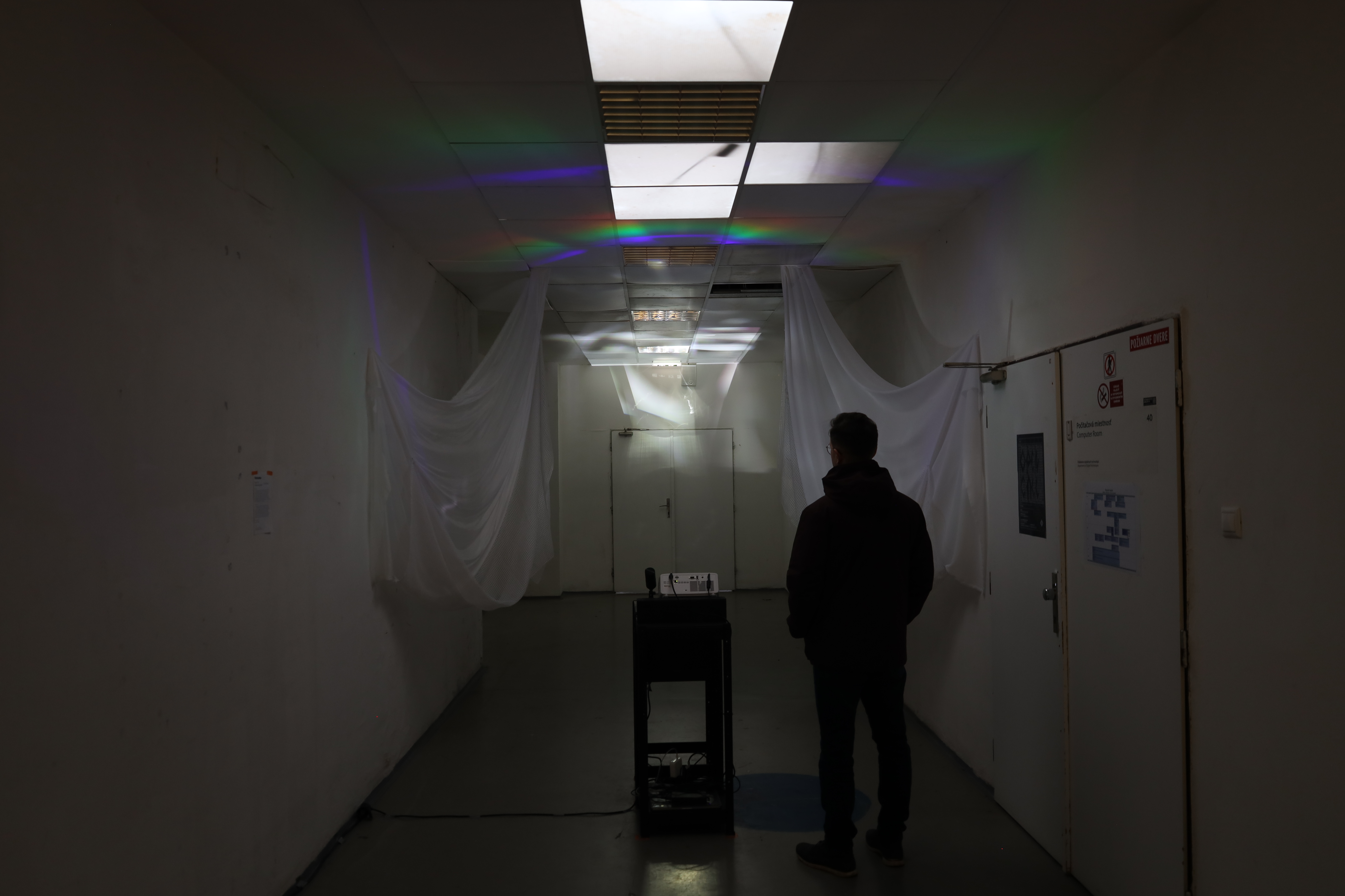 In this interactive projection, the viewer enters a space, which intertwines frequencies, energies and light into a whole. Human voice becomes a trigger for change – each word perturbs layers of light and interrupts the equilibrium. Energy reacts, constantly reshaping itself and spreading according to its own ritualistic dynamics. The work represents a ritual (without a set direction), its layers of visible and invisible, and points to subtle connections between the inner energy of humans and surrounding space.