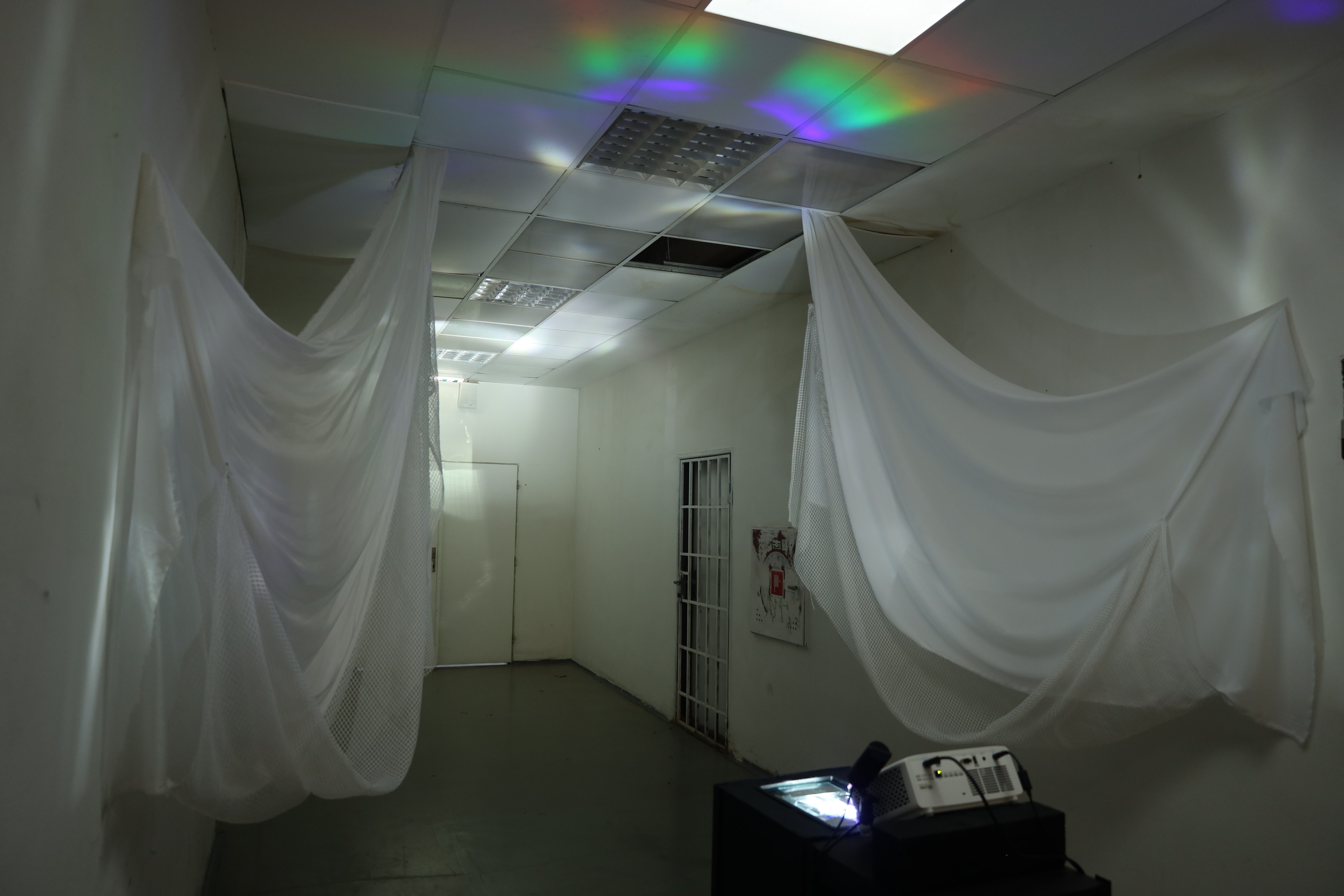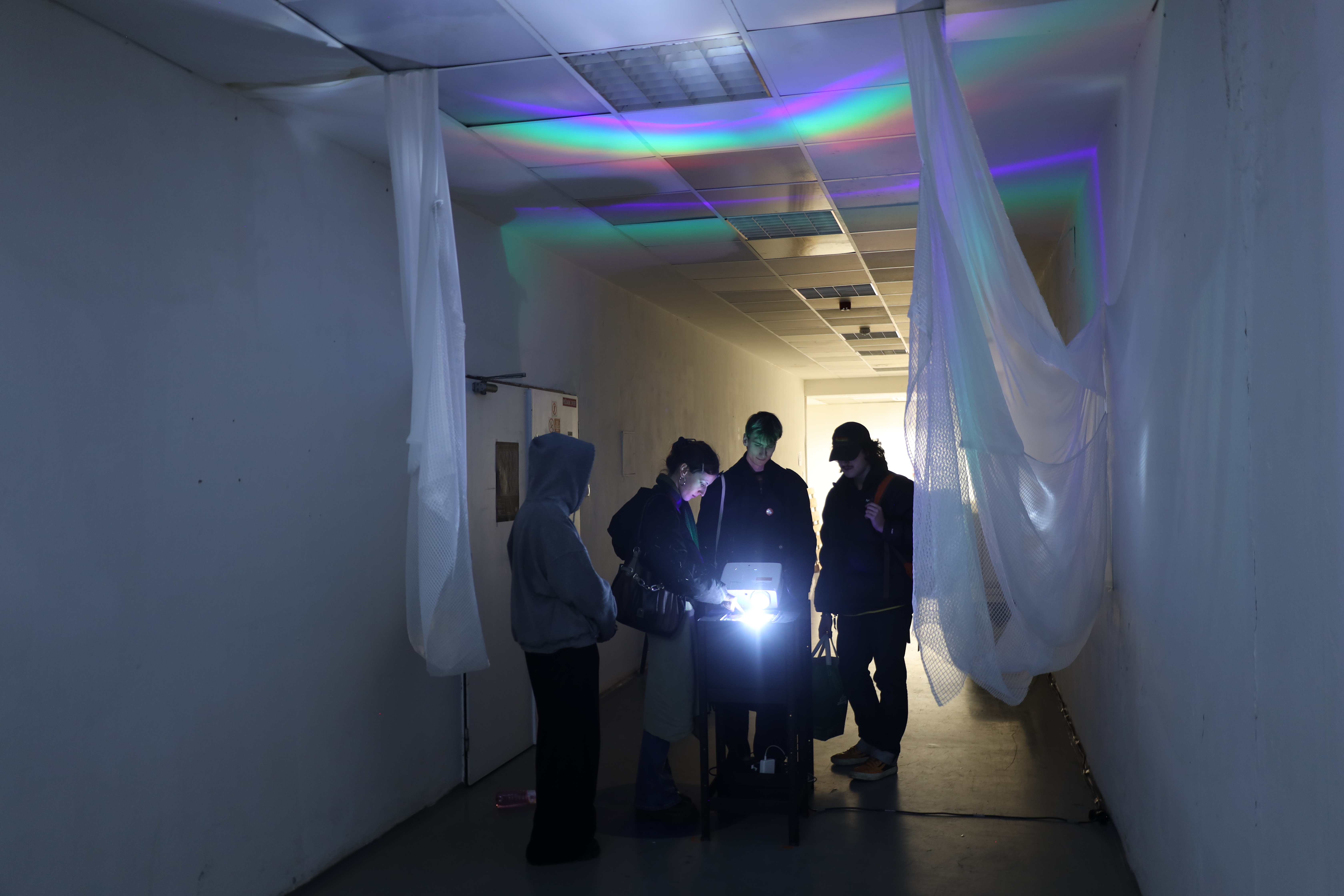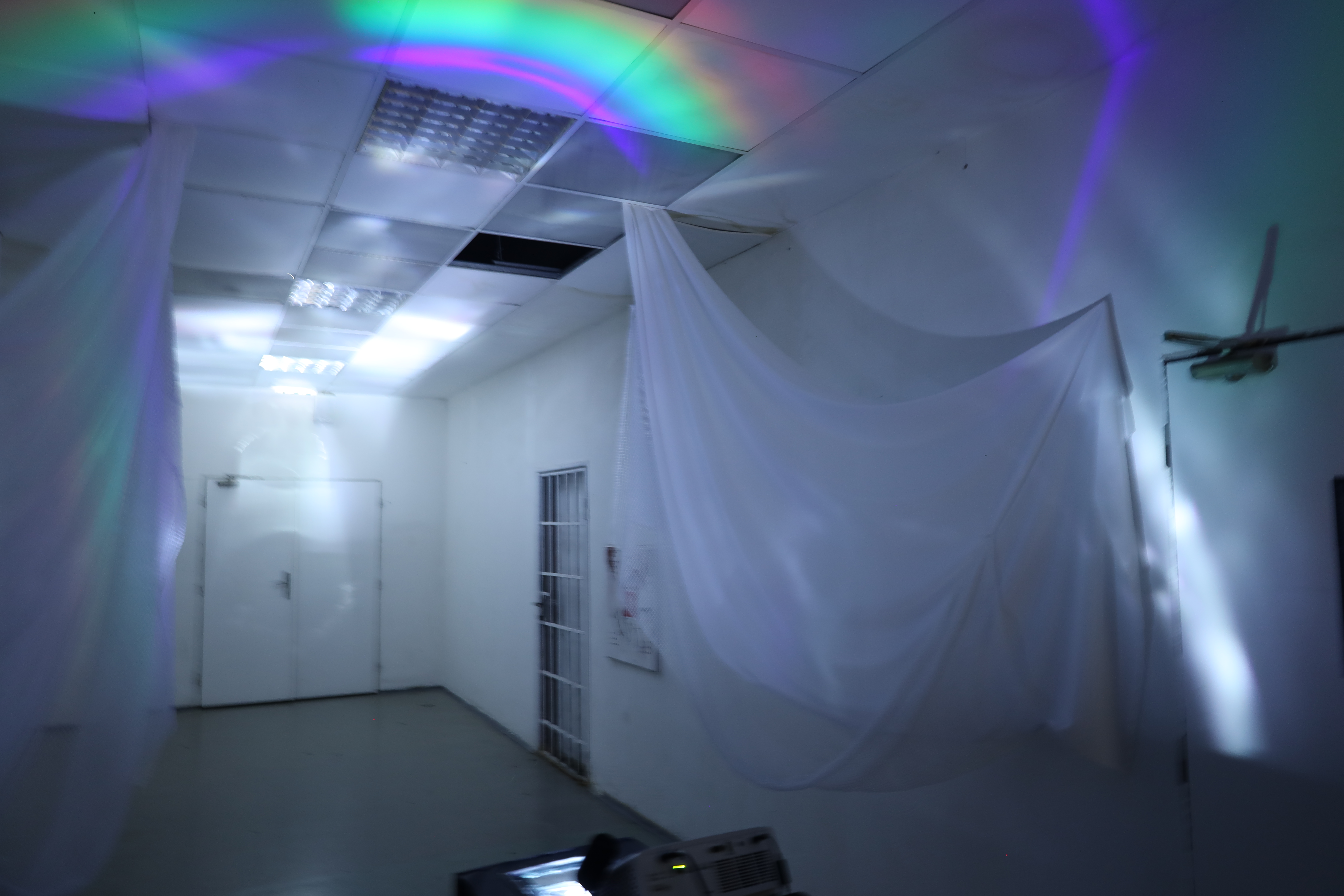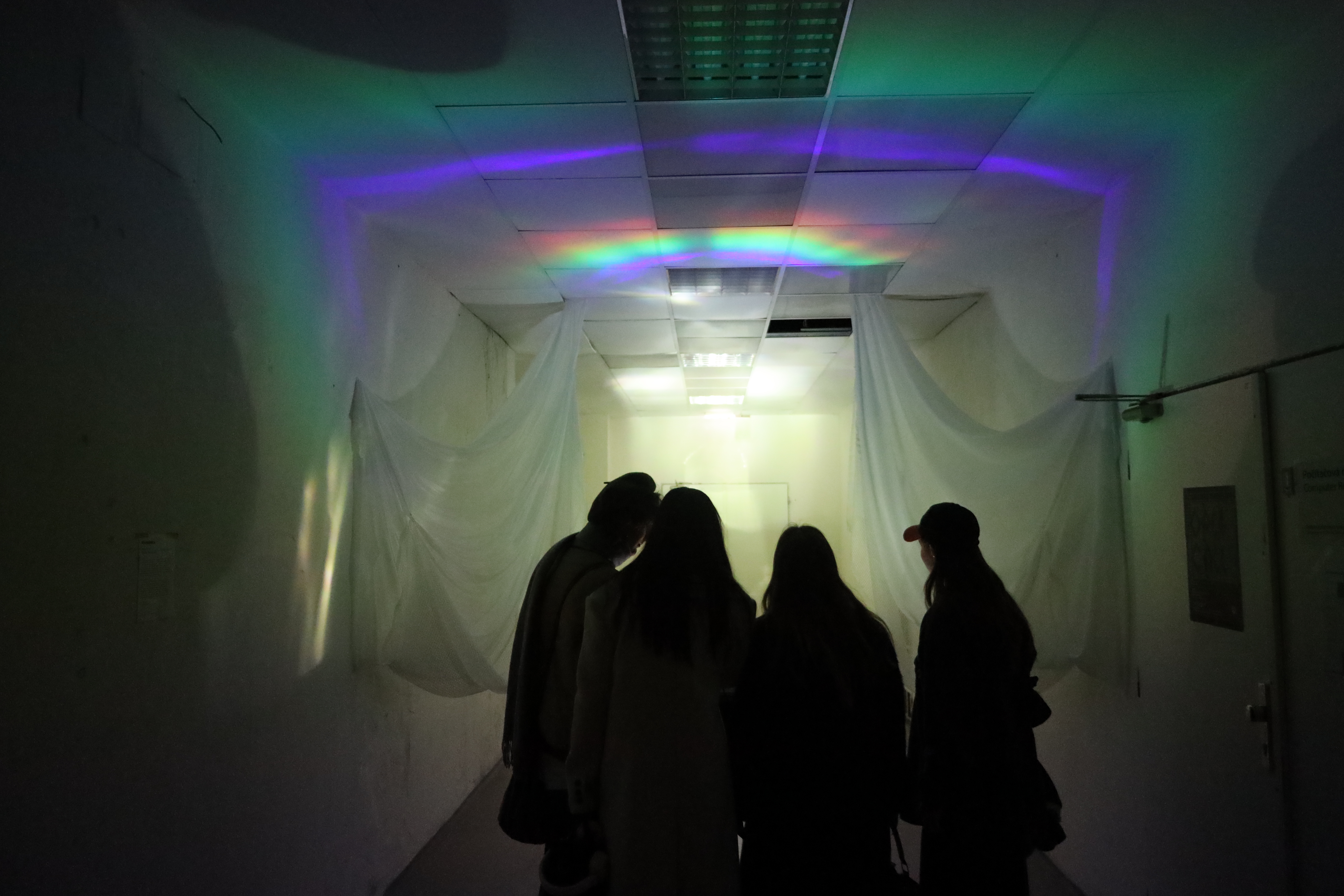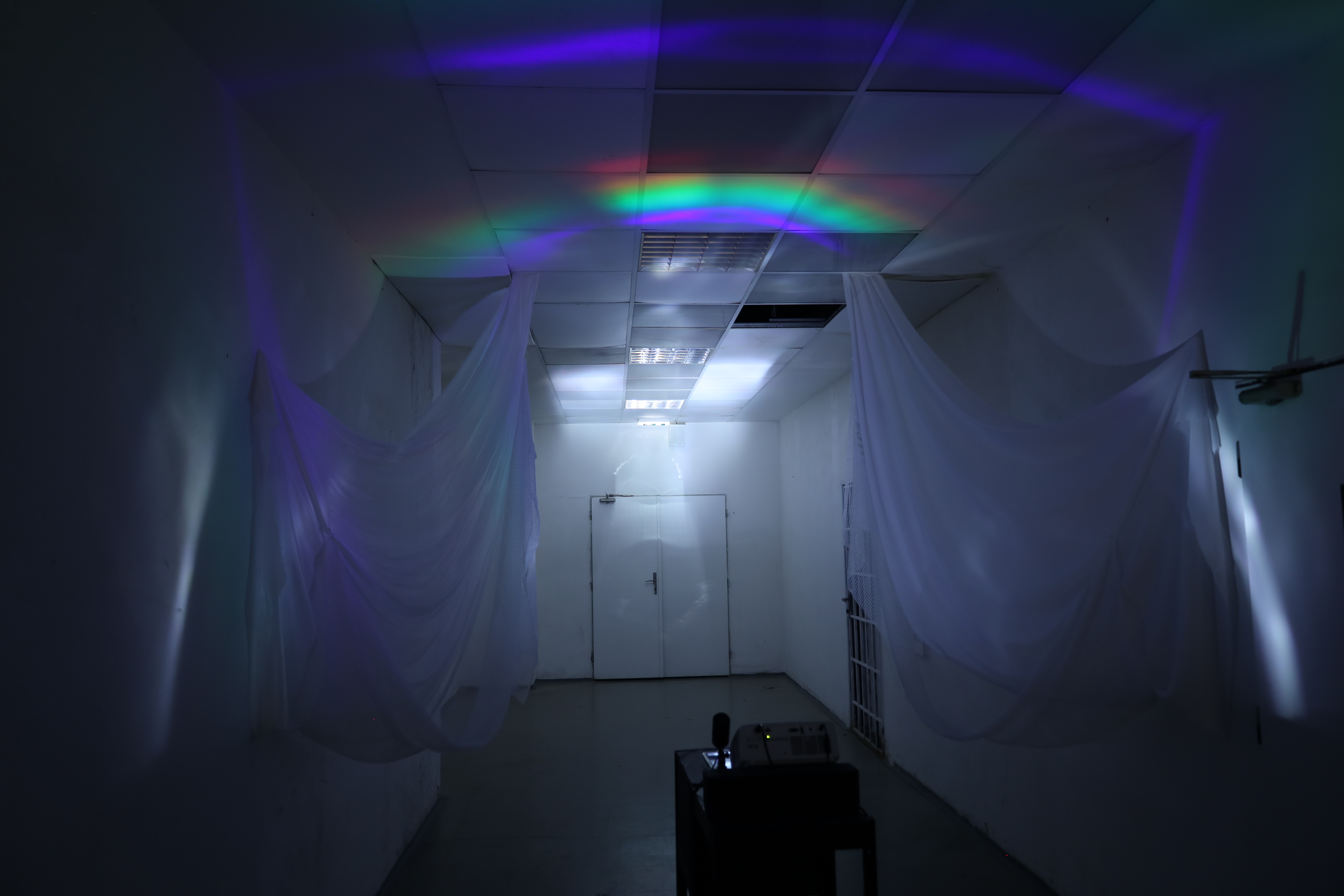 In this interactive projection, the viewer enters a space, which intertwines frequencies, energies and light into a whole. Human voice becomes a trigger for change – each word perturbs layers of light and interrupts the equilibrium. Energy reacts, constantly reshaping itself and spreading according to its own ritualistic dynamics. The work represents a ritual (without a set direction), its layers of visible and invisible, and points to subtle connections between the inner energy of humans and surrounding space.